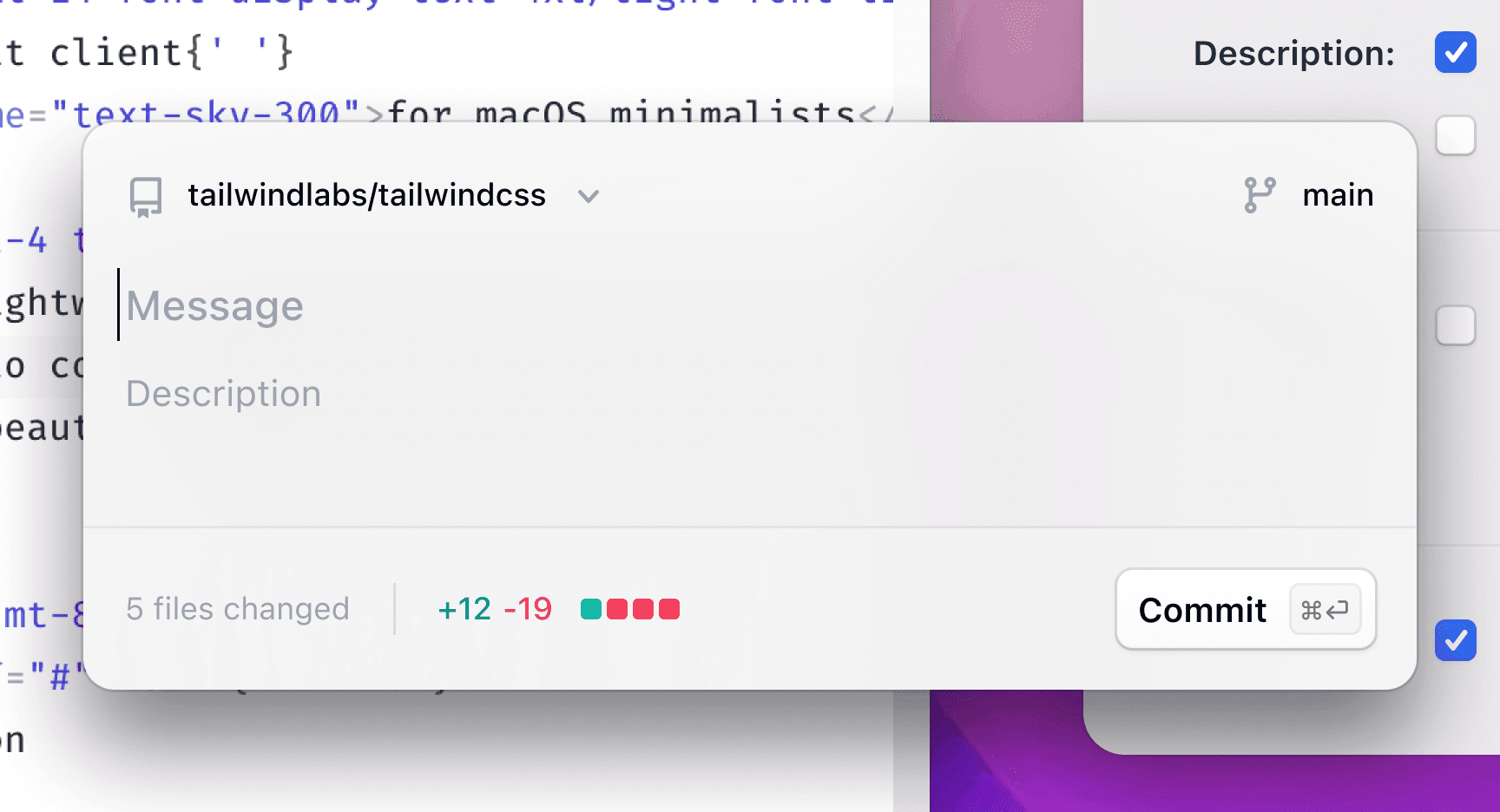 In the latest release, I've added support for commit message and description suggestions via an integration with OpenAI. Commit looks at all of your changes, and feeds that into the machine with a bit of prompt-tuning to get back a commit message that does a surprisingly good job at describing the intent of your changes.